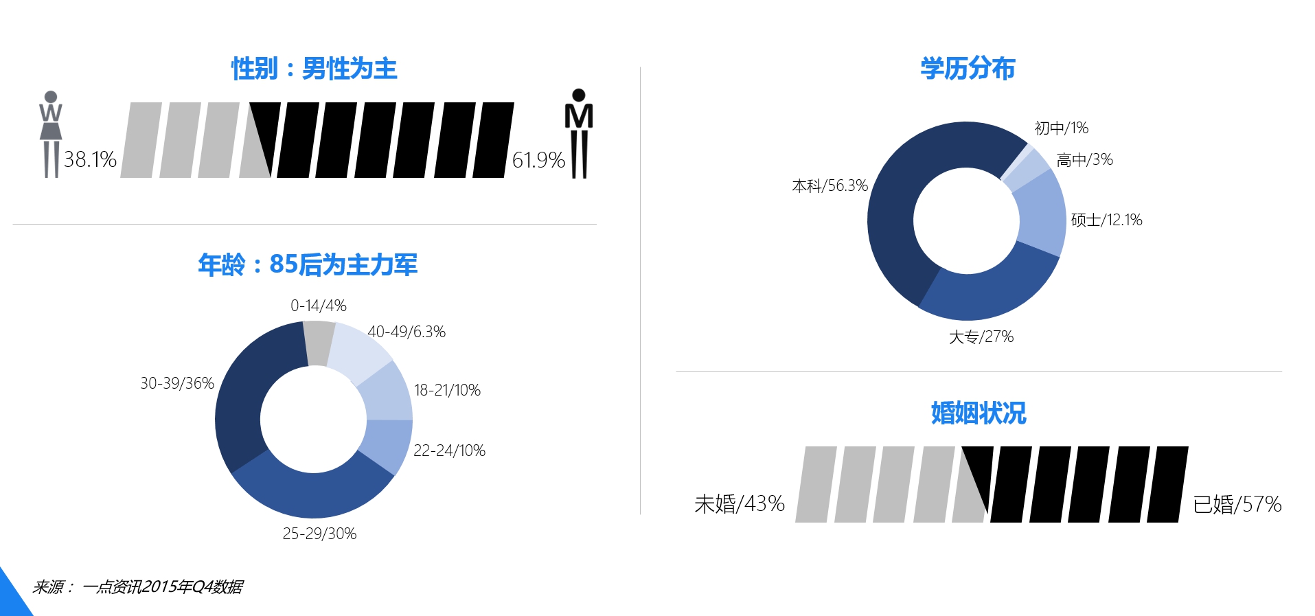 (3)年輕高端。一點資訊的用戶大部分集中在21-40歲之間,90后用戶群占據(jù)主導,擁有潛在主流消費群體,白領、高學歷、高收入人群居多。