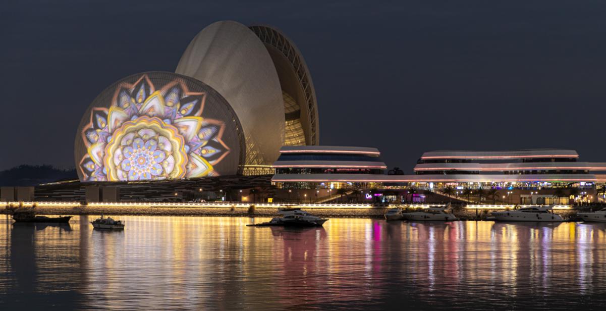 燈光投影項目以珠海大劇院外墻為“幕布” ,周邊安裝有34臺32000流明Barco激光投影、1114盞泛光燈、圖形燈及電腦燈,于2019年11月投入使用,2021年2月正式啟動商業運作,是中國唯一的海島地標媒體。