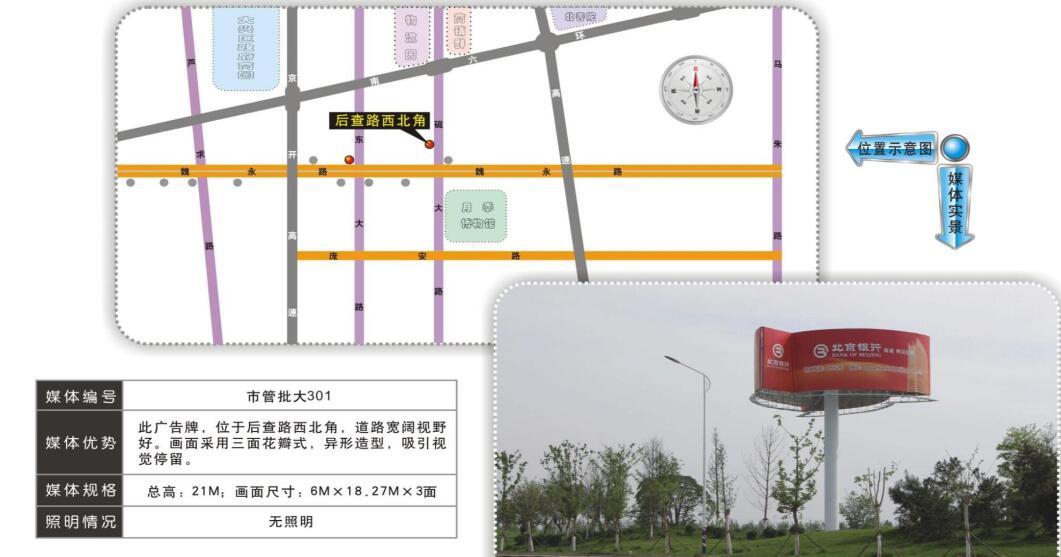 | 亦莊雙面單立柱廣告 媒體位置:榮華北路、榮華南路、西環北路、東區科創五街 媒體規格:12m*4m*2面 |