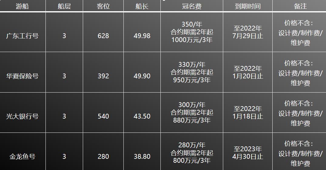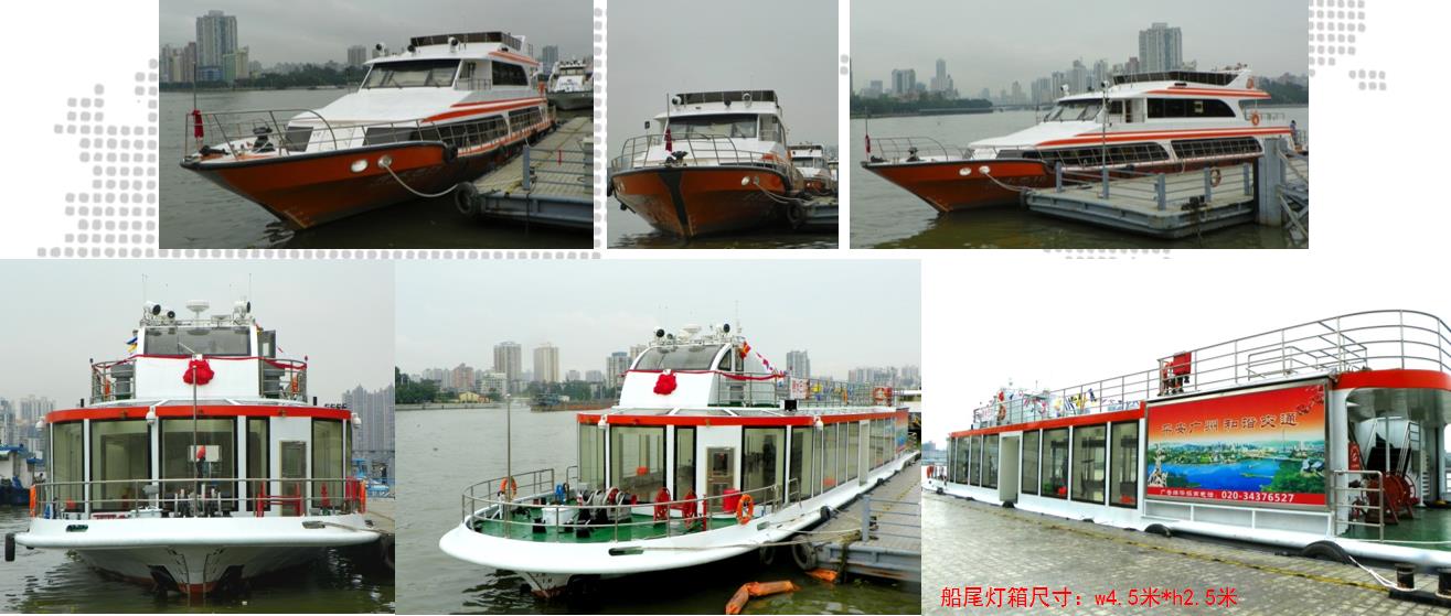 1、船舶冠名廣告(案例如下) 按照客戶的需求,結合船型特點,在游船上設置定制LED、燈箱廣告