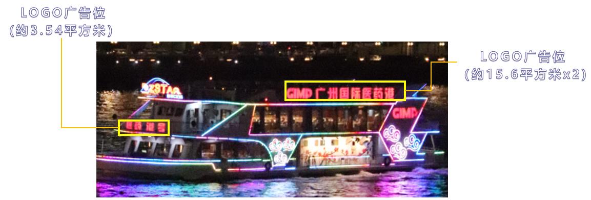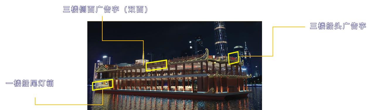 媒體尺寸 | 船身外側廣告字:長-7米、高-0.9米;船頭橫幅廣告位:長-10米,高-1米; 一樓內部整面廣告墻:長-3.4米,高-2.8米。 |