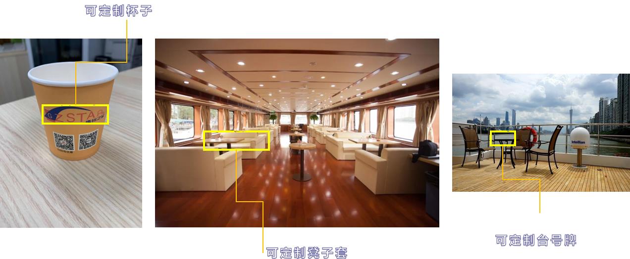 游船內部廣告位:圓桌式坐席區分布1個橫版廣告展示位