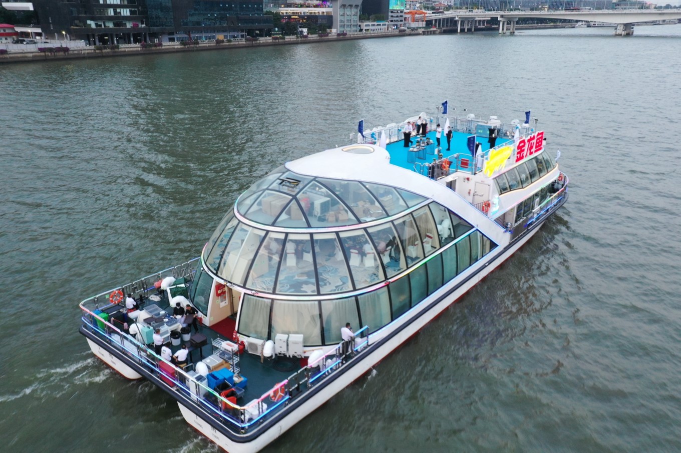 游客乘船游覽廣州塔-珠江黃金水域,可觀望廣州塔、海心沙、珠江新城東西塔、海心沙、花城廣場等標志景點建筑。