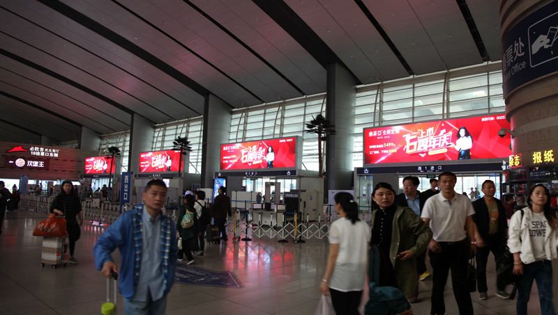 | 北京南站高鐵到達(dá)層廣告 高鐵線路:京滬線 高鐵站名:北京南站 級(jí)別:特級(jí)站 預(yù)估日均人流量:350,000 LCD屏臺(tái)數(shù):面向出閘口(20個(gè)面)/面向公共區(qū)域(21個(gè)面) 規(guī)格:108吋 每天運(yùn)營(yíng)時(shí)間:16小時(shí) 播出頻次(次/臺(tái)/天):960/480 10"刊例價(jià)(元/周):250,000/100,000 |