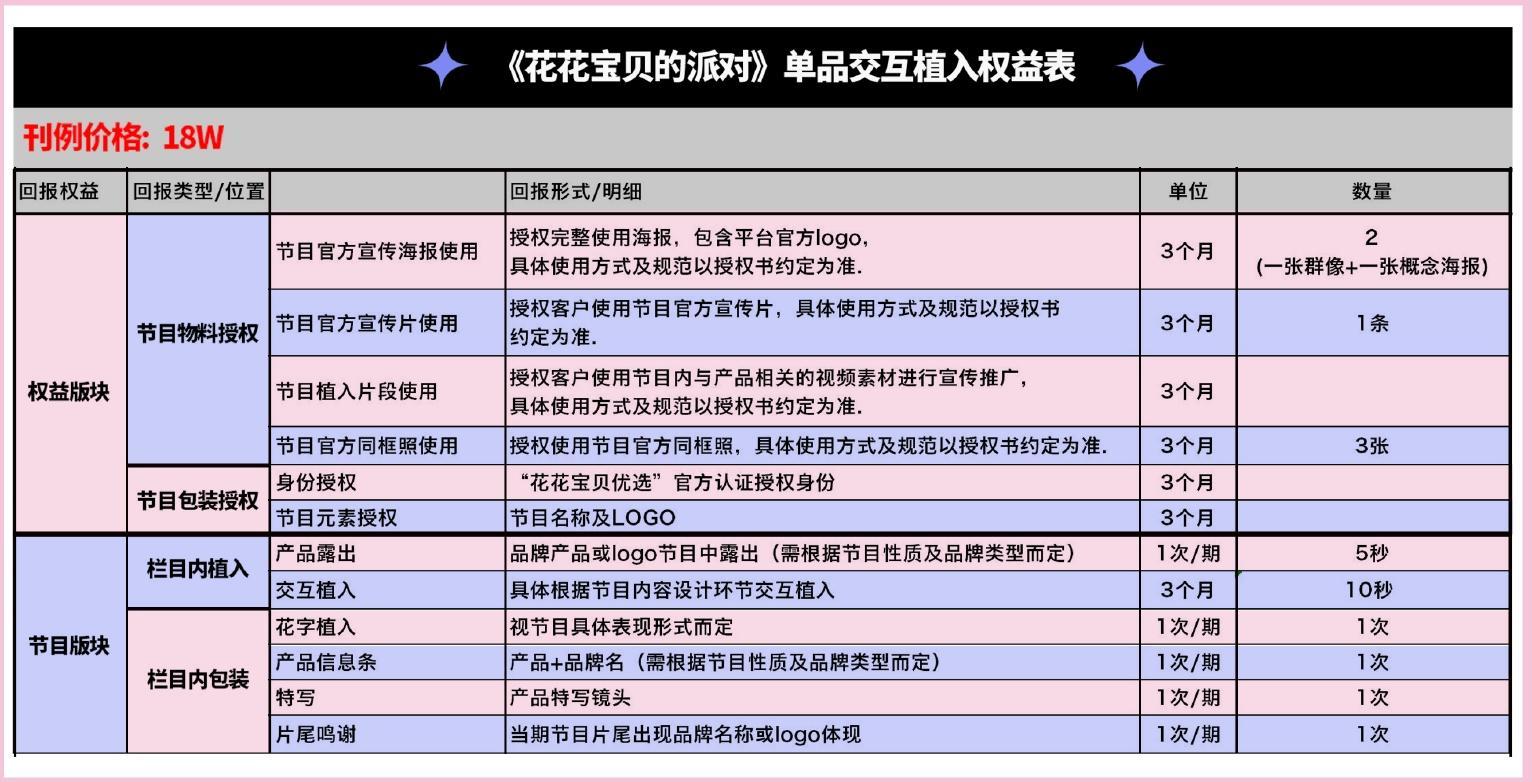 《花花寶貝的派對(duì)》綜藝廣告單品交互植入權(quán)益表