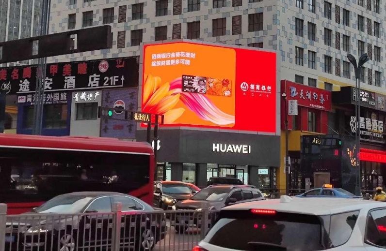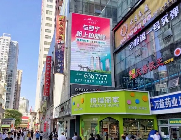 該屏位于西寧市花園北街口,湟光十字東北角恒潤大廈,其色彩飽滿,動態(tài)畫面或多幀切換效果,戶外超清P6顯示屏,畫面展示內(nèi)容更加豐滿,廣告訴求表達(dá)更為完善,強化廣告內(nèi)容可看性。