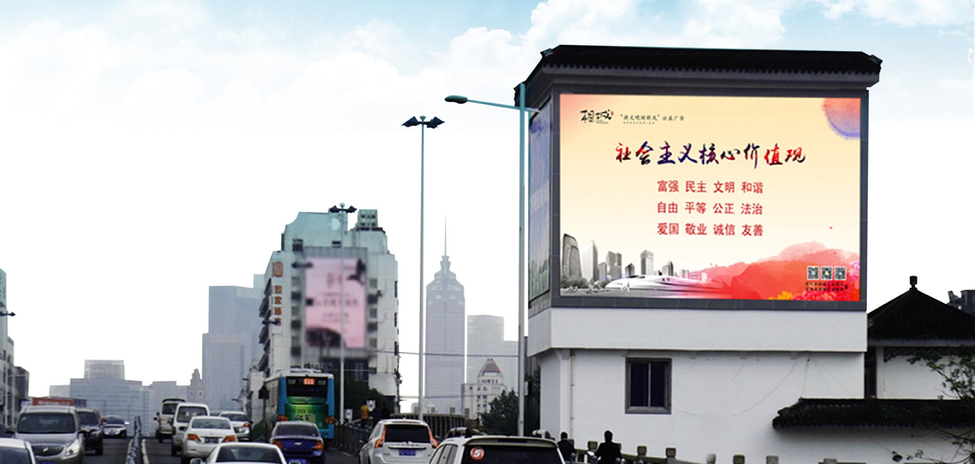 全新更新的高清戶外大屏,加之該廣告位于干將路相門橋段,進園區(qū)入口處,是蘇州市最繁忙的交通干道之一。