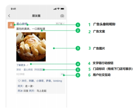 2. 外層圖片、小視頻;3. 外層文案標題(可選);4.外層文案詳情;5.門店標識(有線下門店可選擇展示);6.用戶社交互動。
