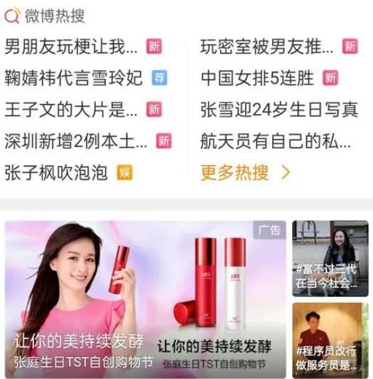 在微博的正文下面,當(dāng)我們閱讀動(dòng)態(tài)或文章時(shí),有時(shí)我們可以看到一個(gè)非常明顯的廣告;在微博搜索框下也有一個(gè)非常明顯的banner廣告位;熱搜欄下方也有類(lèi)似的廣告位;banner廣告空間。這些板塊在日常使用微博時(shí)很容易注意,其特點(diǎn)非常直接,借助用戶停留時(shí)間,提高信息傳輸?shù)某晒β屎托?,只要用戶進(jìn)入文本,找到或找到這個(gè)板塊,就很容易找到廣告banner。但總的來(lái)說(shuō),與其他廣告相比,植入該板塊的廣告更依賴于banner界面和主題的創(chuàng)意是否有吸引力,一般來(lái)說(shuō),因?yàn)橛脩舾矚g這種創(chuàng)意“硬性”植入廣告形成了一定的“抗體”,經(jīng)常主動(dòng)忽視,所以如何提高這類(lèi)廣告的有效推廣是廣告主需要考慮的問(wèn)題。