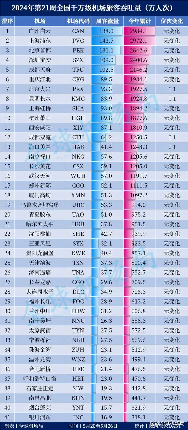 2024年第21周全國千萬級機場旅客吞吐量出爐!(第21周:5月20日至5月26日)上海浦東機場以143.7萬人次的周客流量連續(xù)8周拿下首位,與上周相比,客流量減少了2.4萬人次。從累計客流方面來看,上海浦東機場將其與廣州白云機場的差距進一步拉近至12萬人次。北京大興機場則是在第21周實現(xiàn)了對昆明長水機場的反超,將累計客流的排名提升至第7位。成都雙流反超了海口美蘭,全國排名提升至第12位。
