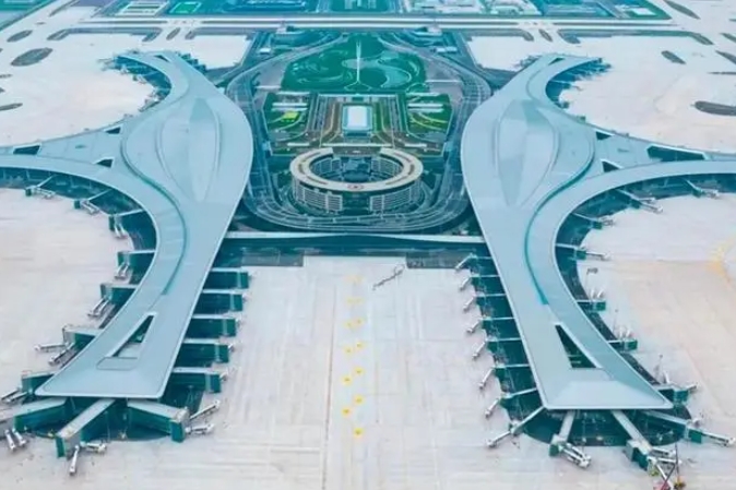 北京大興國際機(jī)場,位于中國北京市大興區(qū)榆垡鎮(zhèn)、禮賢鎮(zhèn)和河北省廊坊市廣陽區(qū)之間,北距天安門46千米、北距北京首都國際機(jī)場67千米、南距雄安新區(qū)55千米、西距北京南郊機(jī)場約640米(圍場距離),為4F級國際機(jī)場、世界級航空樞紐、國家發(fā)展新動力源 。
